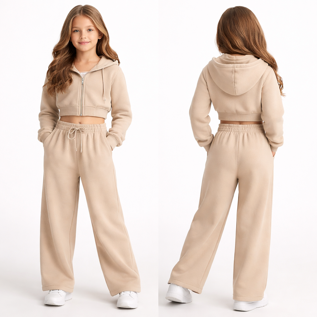 I would like a children's jogging suit for women whose top is long sleeved with a hood, a closure in the middle, a material which is close to the body, an annoying material at the waist which will respond to finishing the waist, then pants at the waist, it's a little awkward and the rest is quite wide, not a tight cut at the ankles in a straight cut, streetwear style, show front and back
