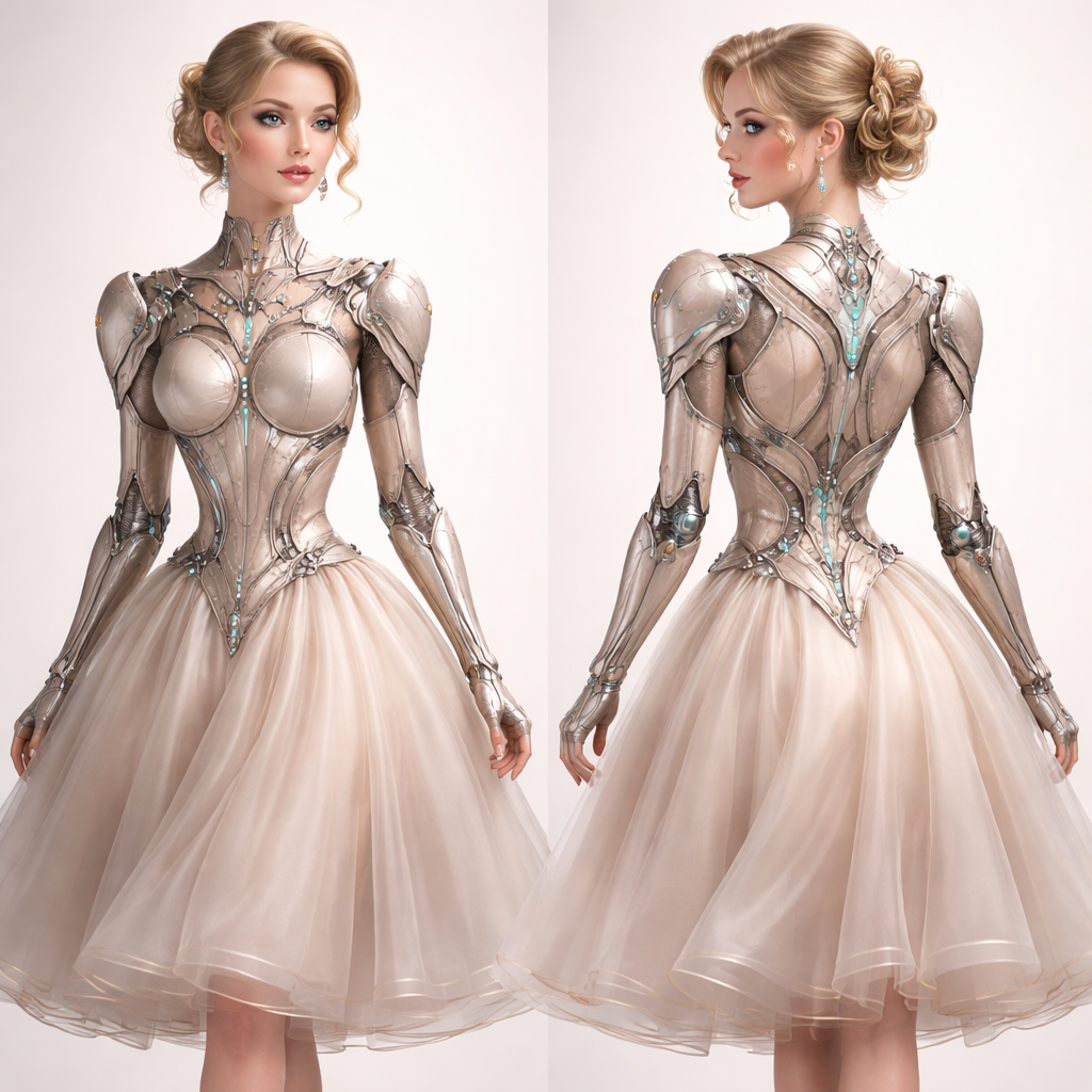 Trend: future armour Layered torso silhouette, blending organic curves with mechanical hinge joints: shows soft armour. She wears a tea dress . More structure and soft power , fifties style, show front and back