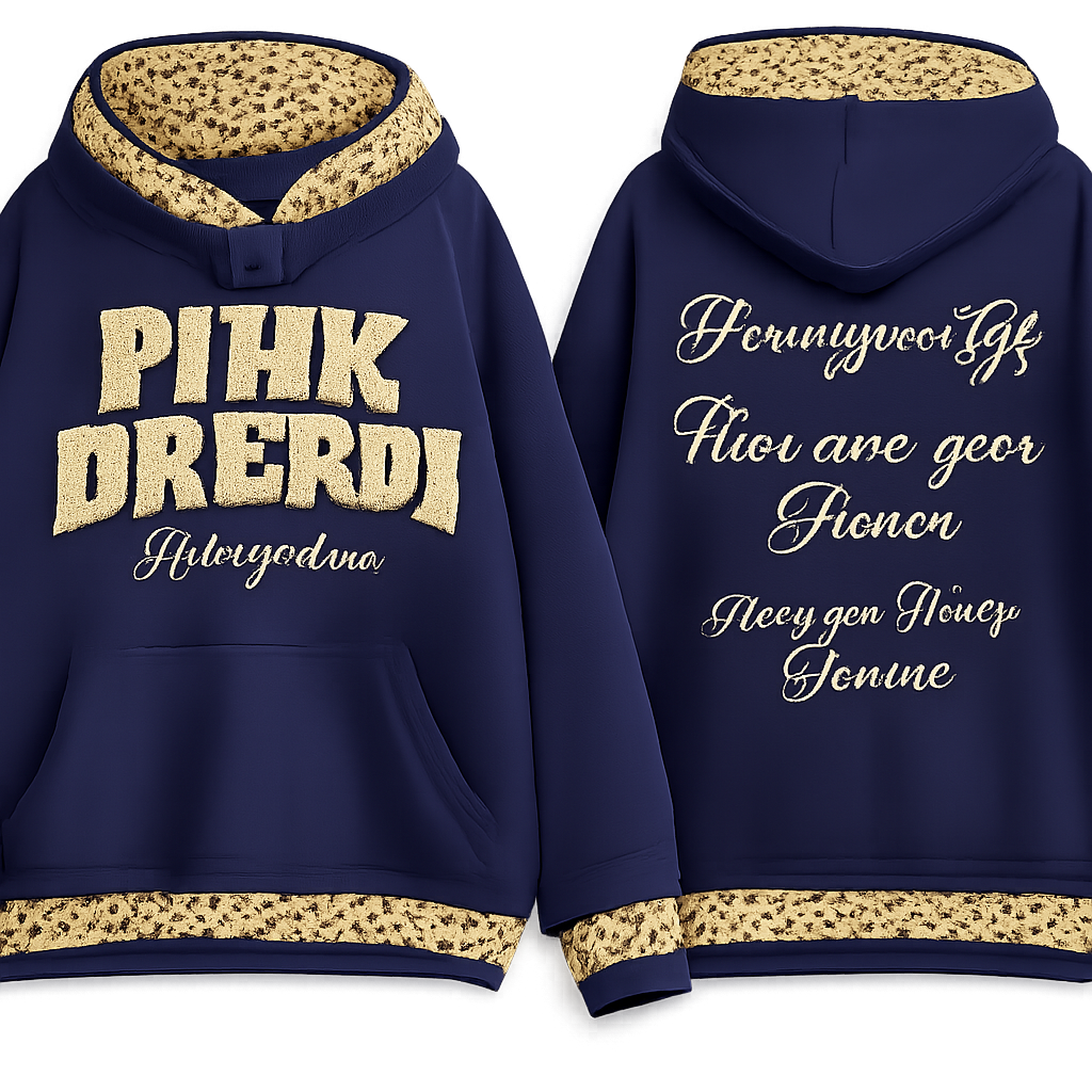Coton ouater mid size de couleur bleu marin.Logo écrit avec des lettres majuscules et épaisse en relief 3D de couleur jaune pale avec motif de leopard(taches dorées).Le logo c’est « PINK DREAM ».En dessous en écriture fines et attaché en jaune/ doré ce sera écrit « by Girly Memory »Dans le dos du coton ouater dans la même écriture attaché et fines, ce sera écrit « Dream your life » et en dessous bien aligné ce sera écrit « Then live your Dream »,c’est 2 phrase de la même couleur que le texte a l’avant du coton.Plus bas dans la même écriture cette fois ci en blanc ce sera écrit « Just live your teenage Dream ».Sur les extrémités des manches donc la partie qui entoure le poignet ce sera la même couleur et le même motif que le logo c’est à dire un motif léopard avec fond jaune et taches doré.Ce même motif ce trouvera aussi sur l’élastique qui est placé autour des hanches du coton ouater et dans l’intérieur de la capuche du sweater et l’intérieur de la poche ouverte des deux côté à l’avant du coton.puis pour finir juste au haut de l’élastique qui fait le tour des poignet donc les extrémités de mes manches et l’élastique autour de mes hanches,il y aura un motif de vagues qui se suivent partout autour donc 2 ligne de « vagues » la 1er jaune comme le fond du motif léopard et la 2e doré comme les taches du motif léopard.Desole de la longue commande merci beaucoup et stp!