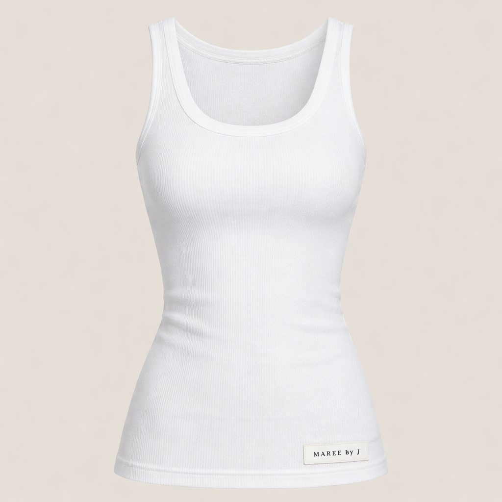 An elevated white tank that's fitted, good quality, has the label Maree by J down the bottom. Make it so it has a razor ...