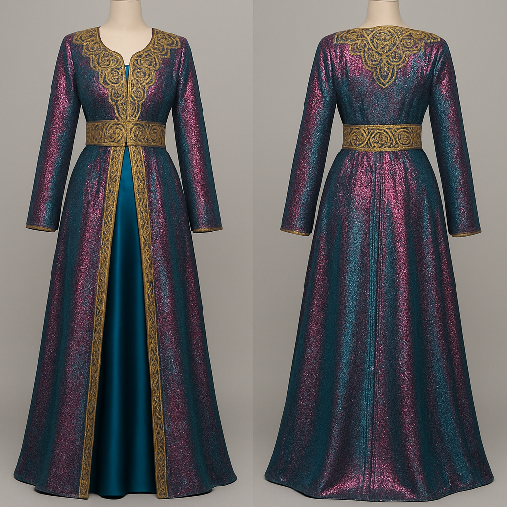 Create a takshita in petrol/pink lamé fabric that shimmers. Sfifa and zwaq maalam should be gold. Sleeves should be long. The under dress should be showing in petrol satin fabric. The zwaq maalam design should be fuller in de upper side (chest)