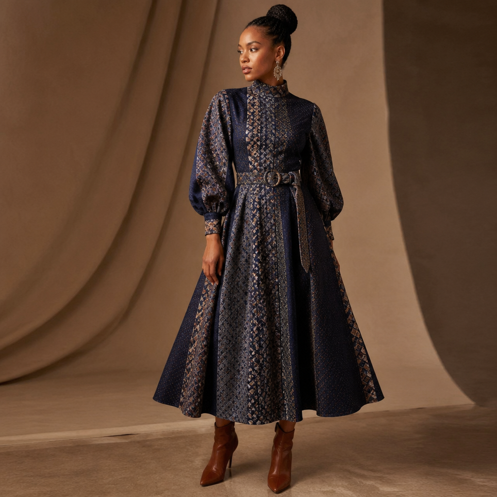 photorealistic fashion design, A Female Dress design, suitable for Fall. Consider South African fashion — diverse multicultural styles, Shweshwe prints, modern Afro-chic. Current season is Autumn in South Africa., just the design no text