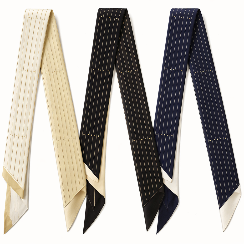 Design a silk scarf that is 5 x 86 cm with oblique edges. Design: Ultra-thin vertical pinstripes (ivory on black, gold on cream, etc.) • Detail: A tiny repeating dot or line every 8–10 cm Best colors: Ivory + soft gold, black + champagne, navy + pearl , classic style, show front and back