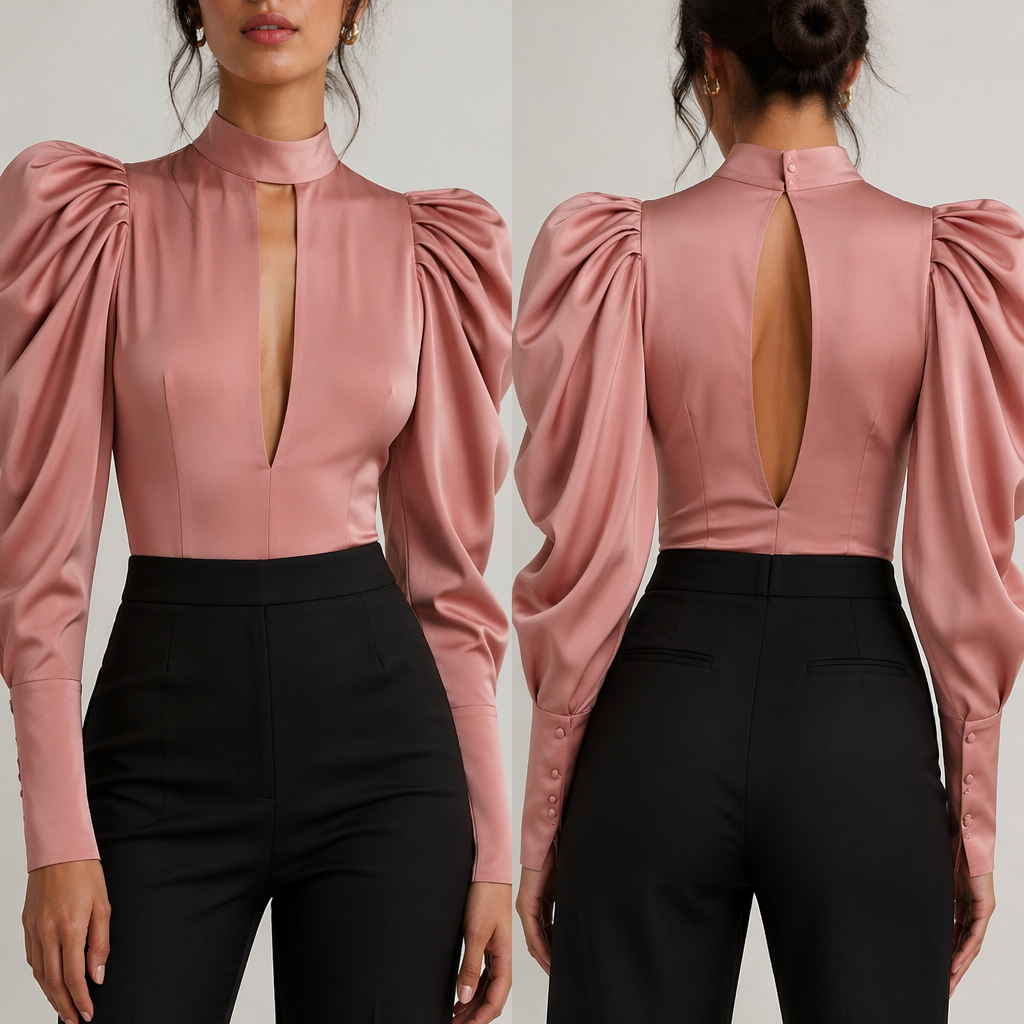 photorealistic fashion design, A high neck rose pink top with a collar at the back and a “V” shaped narrow slit that runs to just the top of the cleavage at the front. It has uber puffy sleeves that narrows and becomes slim towards the wrist where it is buttoned, edgy style, just the design no text, show front and back