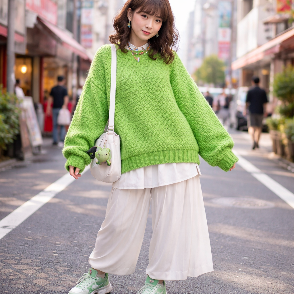 Japanese Street fashion design: Cute chunky oversized bright green sweater, worn with a relaxed fit, layered over a longer top, and paired with loose pants or a pleated skirt for a playful, comfortable, and slightly quirky modern look.