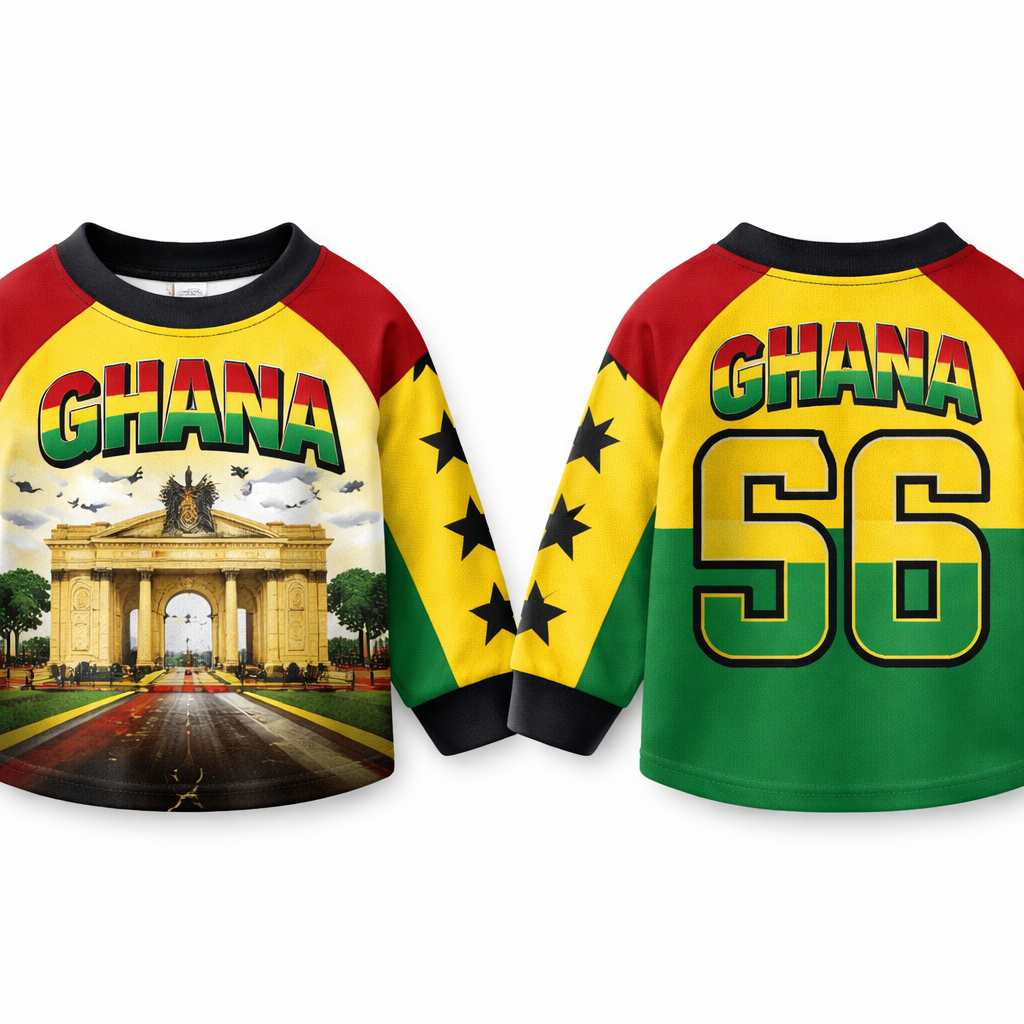 I want a football long hands baseball jersey with Red ,Yellow and green with black stars and with a picture of Ghana independence square in front for infants