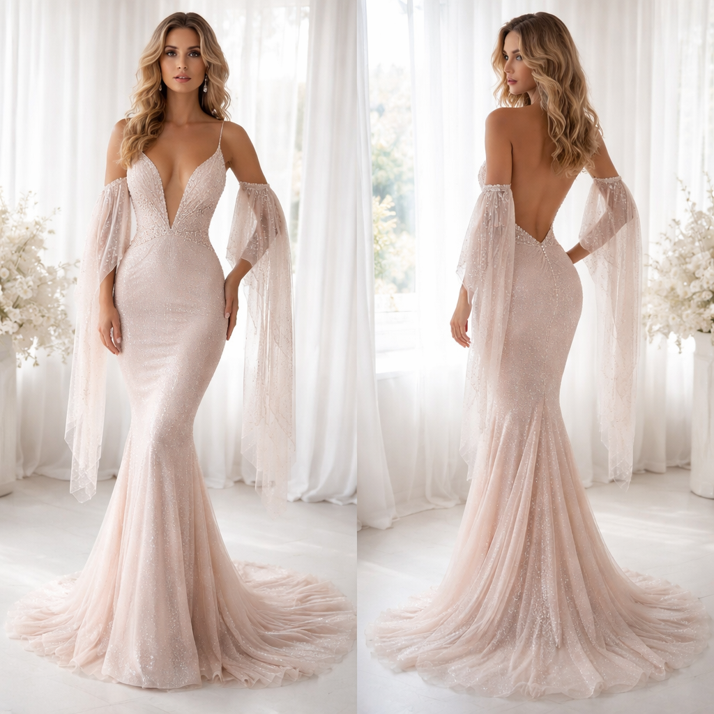 Tight dress especially around the waist, light pink and shell like colour's with lace sleeves which hang and a tail by the feet, a deep v neck down to the stomach but not below the belly button. Must have themed be shimmering , minimalist style, show front and back