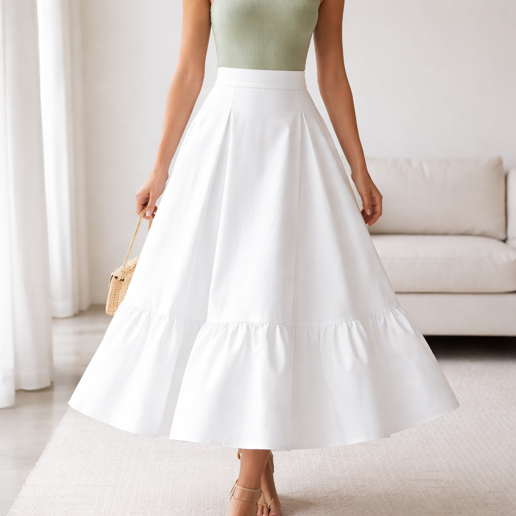 a crisp, optic-white cotton poplin midi skirt. I want it to have weight, so it holds that sharp A-line shape, but with a deep, tiered hem to give it movement when you walk. We’re doing a high-rise waist to elongate the frame. form-fitting, ribbed knit tank in a pale sage
