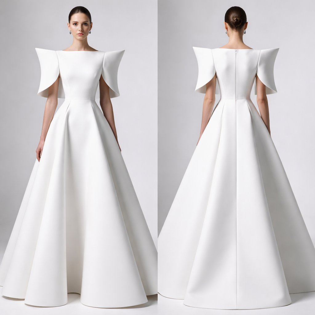 A floor-length sculptural gown with a structured trapeze silhouette. The bodice is firm and upright, extending into a dramatic angular skirt. Neckline is high and straight. Sleeves are sculpted into sharp folded forms resembling wings, stopping at the elbow. Fabric holds shape with minimal drape., minimalist style, show front and back