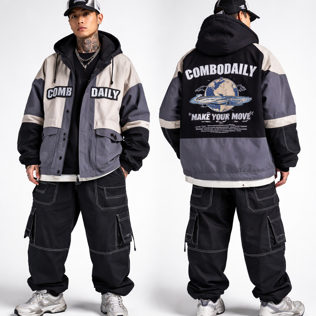 Combodaily branded on back hoodie sleeves on a black girl model in a basement environment