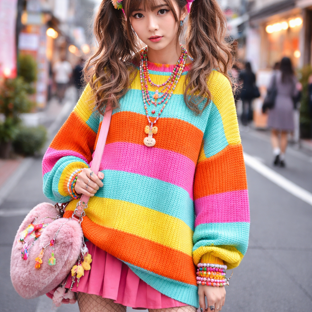 Japanese Street fashion design: Oversized sweater, bright yellow, dark orange, hot pink, and aqua stripes, knitted cotton, relaxed fit, styled with eclectic accessories, layered for a distinctive Harajuku look.
