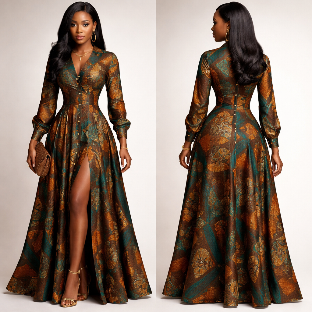 Crée une robe longue soft et élégante en tissu dampé sans ceinture Le style doit être une belle robe africaine fais en tissus africain un autre model stp avec bouton et fente devant fais ma mèche 3/4 , business style, show front and back