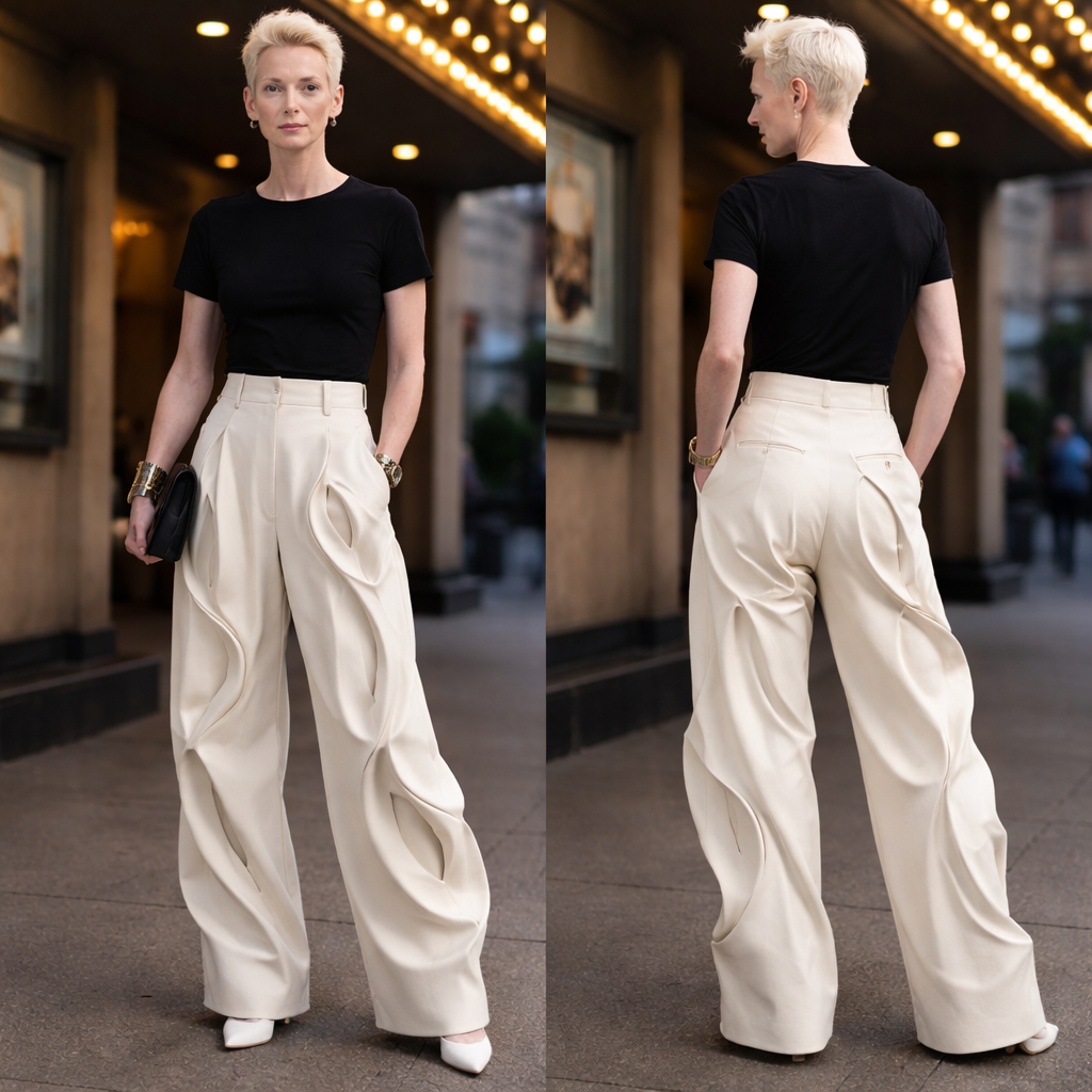 To create a pair of trousers for Tilda Swinton using the fabric manipulation technique shown in your images. They are to be casual, going out to watch a movie. follow these steps: ### Design Concept 1. **Silhouette Inspiration**: Consider Tilda Swinton's unique style, often characterized by avant-garde silhouettes. Incorporate a wide-leg or tapered design to reflect her fashion-forward attitude. 2. **Fabric Choice**: Select a lightweight fabric that holds shape well, like a structured cotton or a blend with some stretch. This will enhance the drape and allow for the manipulation technique. ### Pattern Development 1. **Base Trousers Pattern**: - Start with a basic trousers block pattern that fits well. Adjust the waist and hip measurements to ensure a comfortable fit. 2. **Adding Fabric Manipulation**: - Use a fabric manipulation technique as shown in your images: - Create a pattern that includes at strategic points to add texture and volume. - Experiment with the placement of these openings to create dynamic shapes along the legs. ### Construction Steps 1. **Cutting the Fabric**: - Cut the main trouser pieces according to your adjusted pattern, ensuring to add seam allowances. - Cut additional pieces for the *otoshiana* elements, ensuring they are slightly larger than the required size. 2. **Assembling the Trousers**: - Follow the steps from the images: - Position the *otoshiana* pieces where desired, ensuring they are larger than the cut holes in the trousers. - Pin and machine-stitch these pieces to the main fabric, focusing on the design's interplay between the openings and the fabric drape. 3. **Finishing Touches**: - Construct the waistline and add any closures (like a zipper or buttons). - Hem the trousers to the desired length, allowing for a slight flare or taper at the bottom. ### Styling - Consider pairing the trousers with a fitted top or an oversized jacket to balance the proportions. - Accessories can include bold jewelry or unique footwear to complete the look. By integrating the *otoshiana* technique into the trousers, you'll create a piece that not only reflects Tilda Swinton's distinctive style but also showcases innovative fabric manipulation. , fifties style, show front and back