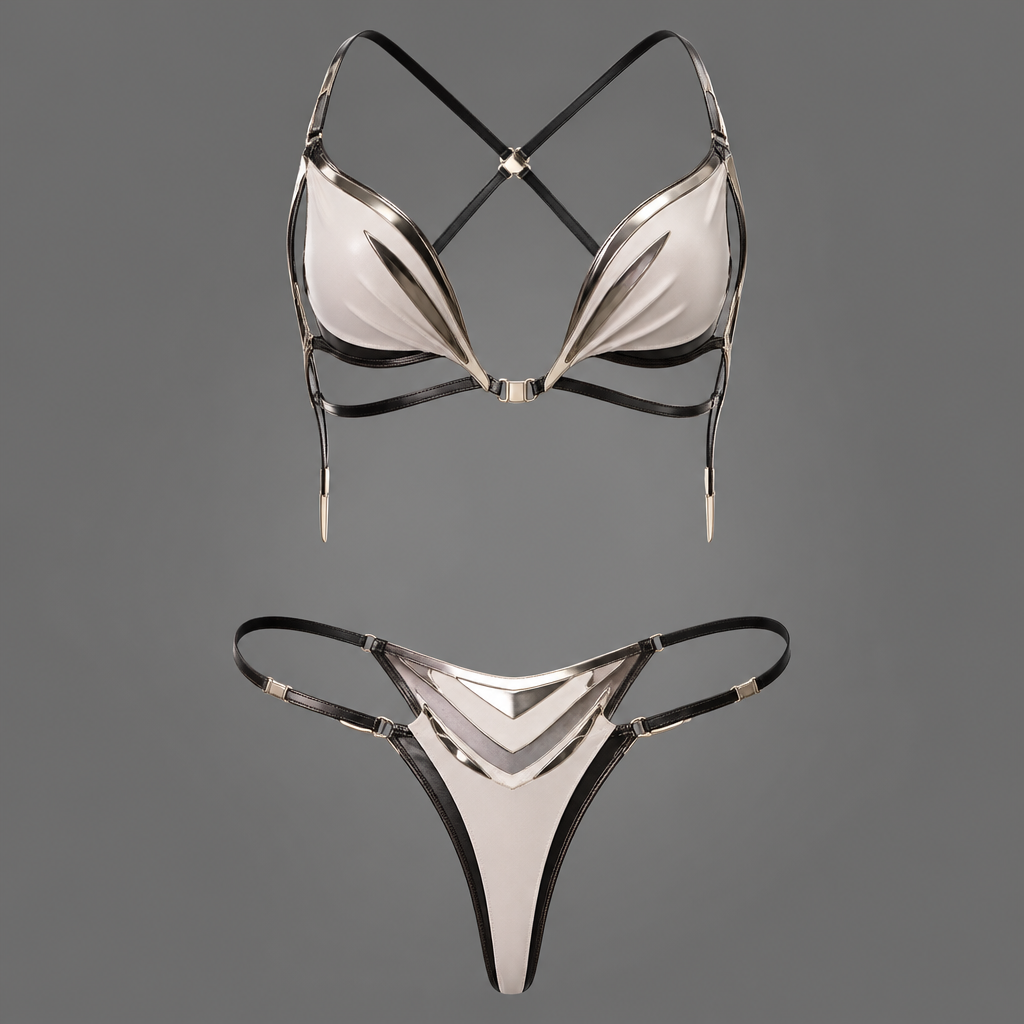 photorealistic fashion design, A Female Swimwear design, in Japanese Street style. traje de baño futurista sexy y muy elegante de dos piezas en hilo dental. VE fashion aesthetics., japanese_street style, just the design no text