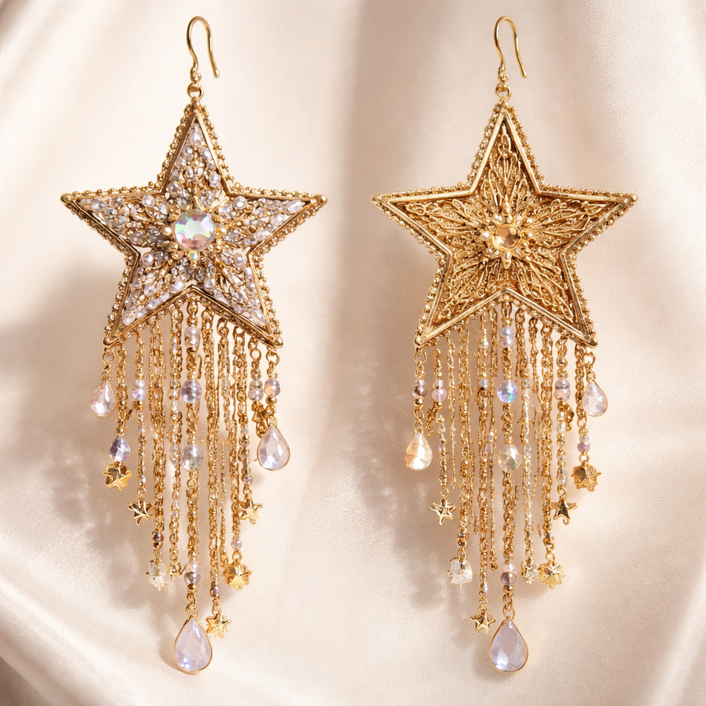 Star shaped earrings. More bohemian , glamorous style, show front and back