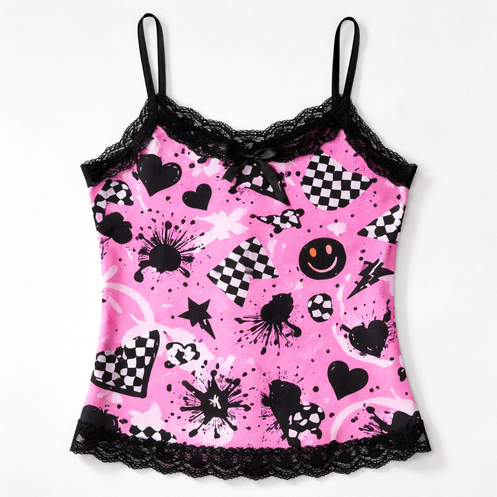 Korean Fashion fashion design: Bright pink, black, and white cotton tank top with a playful, abstract pattern. Features black lace trim and a relaxed fit, typical of Korean streetwear.