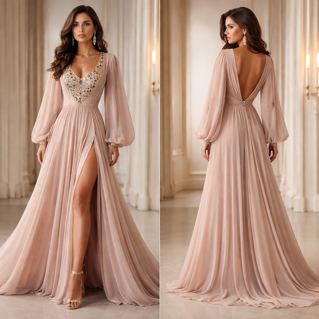 深肉色雪纺面料,长裙,深V领,大宽袖左腿下方开叉到大腿,胸前镶嵌12个宝石像圣经中以弗得祭祀的衣服, formal style, show front and back
