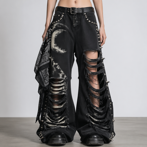 A Female Pants design. чёрные с рисунком луны широкие сильно порваны с банданой на боку и шыпами. Poland fashion aesthet...