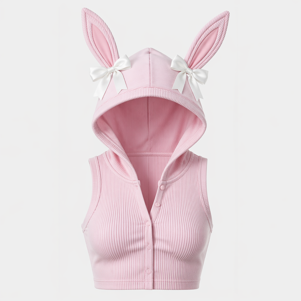 photorealistic fashion design, A Female Top design, suitable for Spring. розовый топик с белыми бантиками на капюшоне у ъшки зайчика. Poland fashion aesthetics., just the design no text