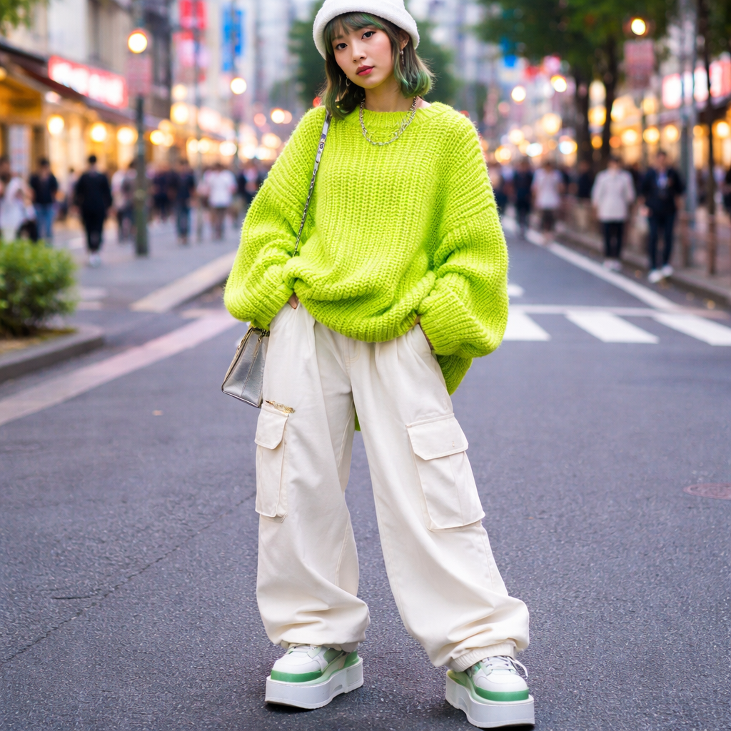 Japanese Street fashion design: Oversized bright neon green sweater, chunky knit. Paired with wide-leg pants and platform sneakers, a playful and bold silhouette.