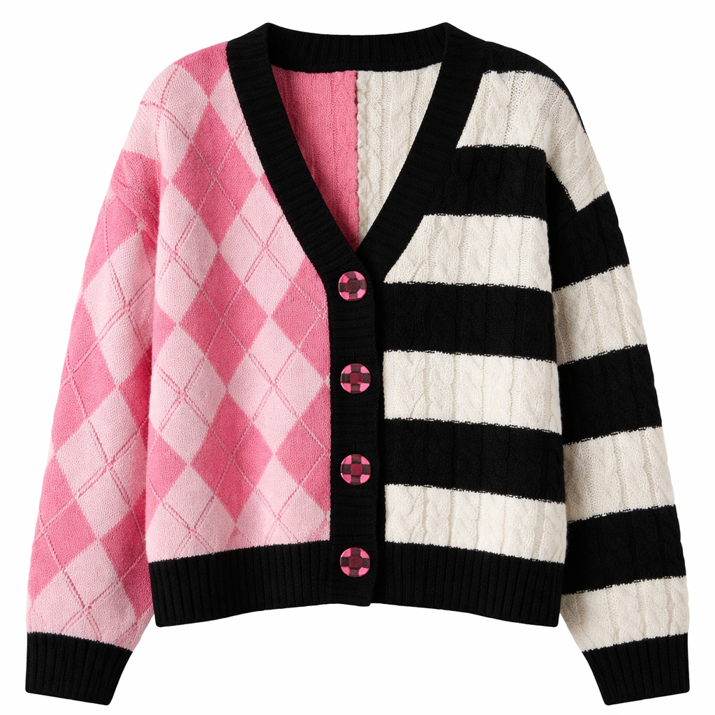 Luxury fashion design: Luxury cable knit cardigan, one side hot and light pink argyle, other side broad black and white stripes. Boxy fit. Merino wool. Black and hot pink checkered buttons.