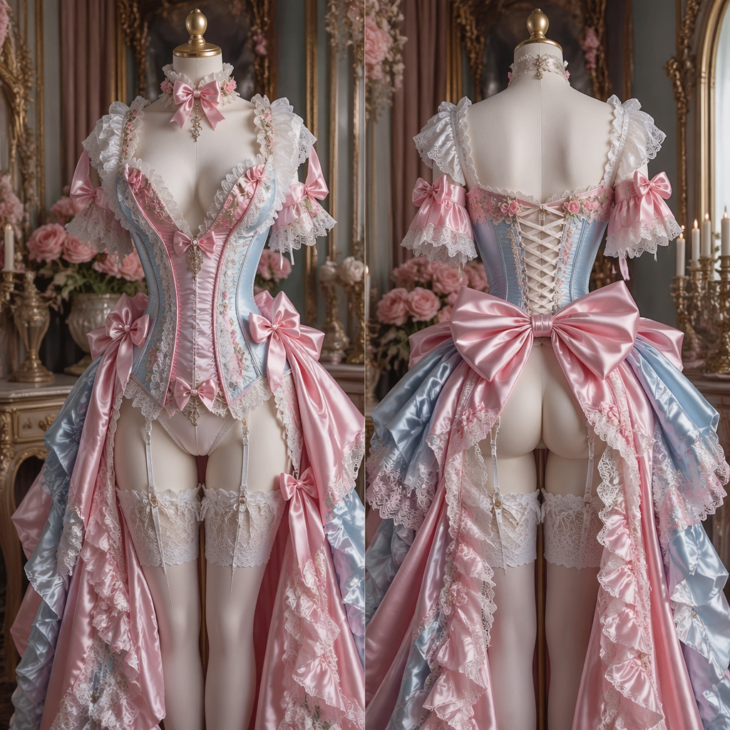 photorealistic fashion design, Marie Antoinette inspired corset lingerie, luxurious satins, beautiful lace, deep plunging neck and absolute maximalist boudoir, exquisite ribbons, petticoat train in back, pastel pink and blue, hints of deep pink, lace leg garters, , glamorous style, just the design no text, show front and back