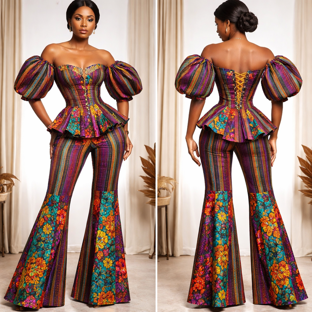 A one of a kind top and pant using coloful aso oke with a beautiful Ankara fabric that will have an elegant and sophisticated classic look, vintage style, show front and back