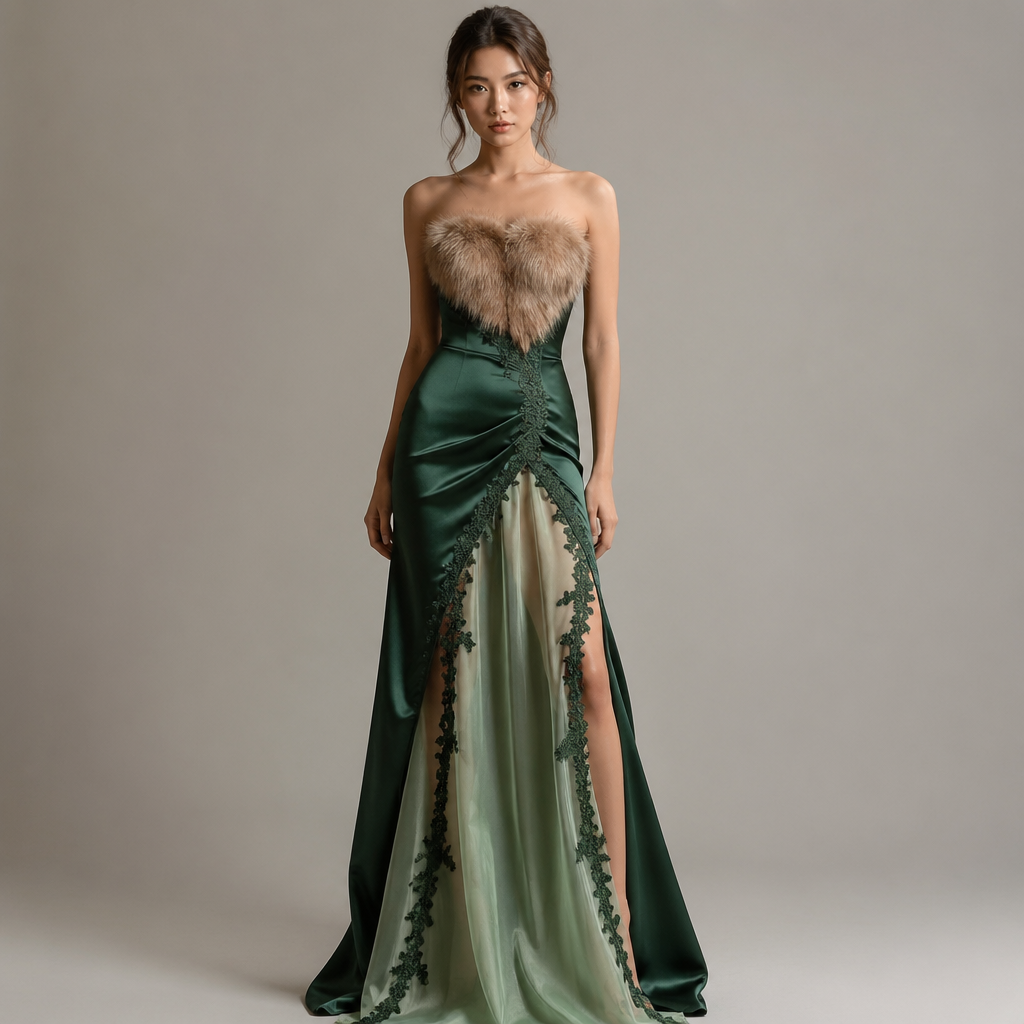photorealistic fashion design, photorealistic fashion design, A Female Dress design, in Casual style. the chest area is light brown fur and the hip/waist area is dark green and the opening between legs is light green chiffon and with flowry dark green laces. SY fashion aesthetics., casual style, just the design no text. Refinement: make the fabric sateen, just the design no text. Refinement: make Only the dark green parts sateen, keep the light green as it is along with the fur, also put it on a model