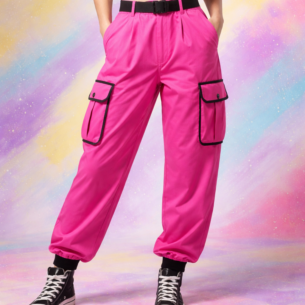 Eighties fashion design: Hot pink cotton cargo pants, lightweight, loose fit, tapered leg, black trim, high waist, side pockets.