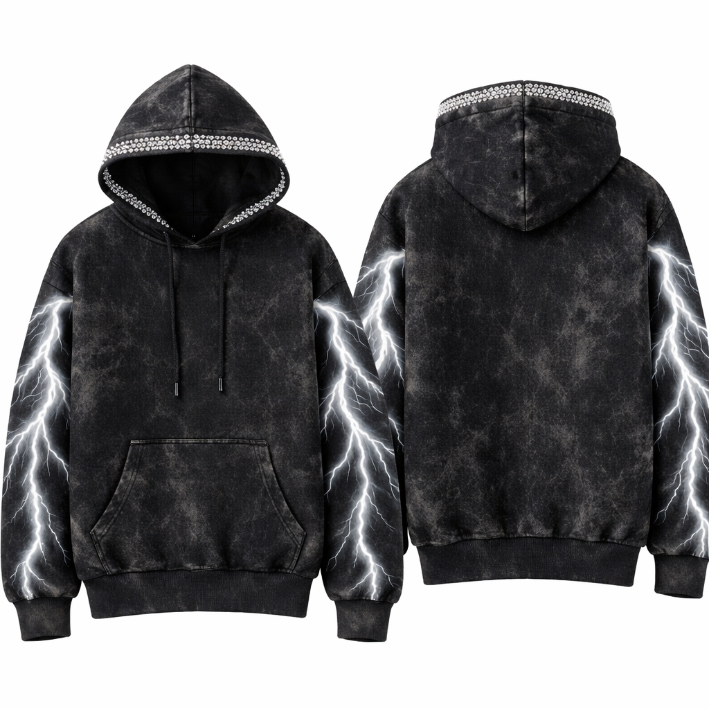 Acid wash black hoodie with 3d white lightning on the arms. With white rhinestones going around the edge of the hood. , show front and back