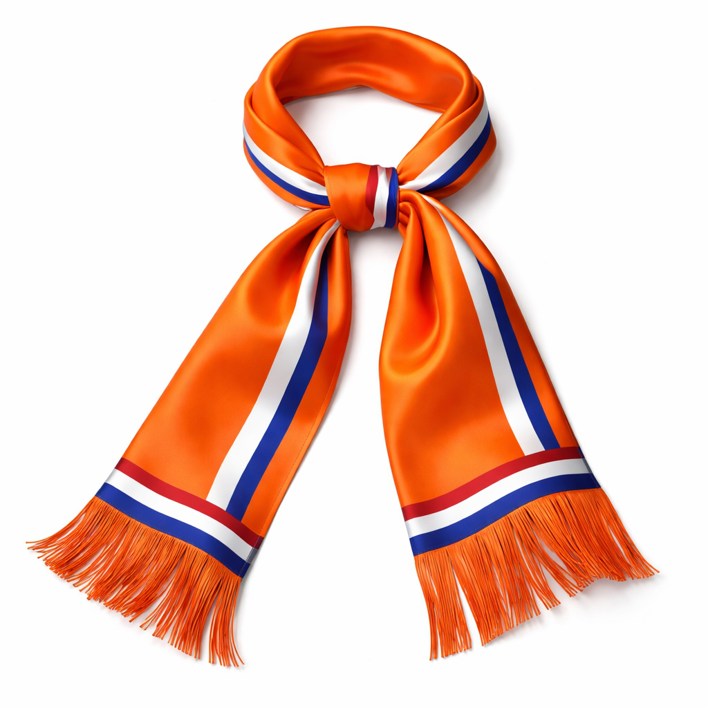 Design a silk scarf that is 5x86cm that is Netherlands colors for their soccer team for the World Cup 2026. Just colors no logos. More orange , classic style