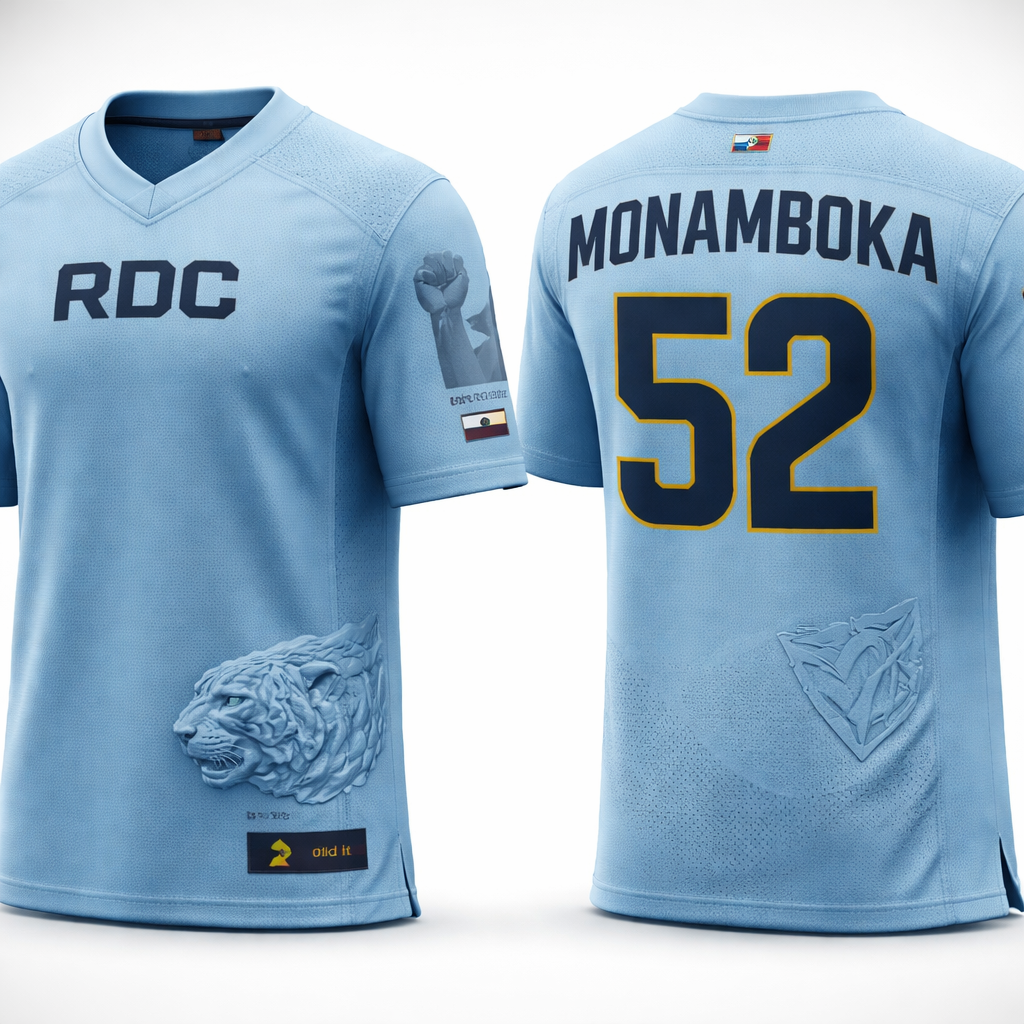 Ultra-realistic high-end men’s American football jersey inspired by professional NFL style. Structured slightly oversized athletic fit with authentic breathable mesh fabric, visible ventilation holes, stitching details, and realistic sportswear texture. Main color: light blue (sky blue). FRONT: clean and minimal. Only “RDC” on the upper chest in a bold athletic font. No number on the front. SLEEVES: on one sleeve, add a minimal abstract silhouette of Patrice Lumumba standing with his hand raised. The design should NOT look like a drawing or illustration, but a simplified emblem-like shape (iconic outline style). On the same sleeve or near it, include a very subtle small DRC flag detail (red, blue, yellow), minimal and refined, not oversized. SIDE PANEL: include a highly realistic leopard head, but NOT fully illustrated. It should appear as a sculpted, abstract form emerging from the fabric, like a textured shape integrated into the jersey rather than a printed drawing. Below it, add “We did it” in small minimal text. OPPOSITE SIDE PANEL: subtle African-inspired geometric emblem. BACK: “MONAMBOKA” written across the upper back in large bold athletic letters, but slightly curved in a natural arch shape (not straight). Below it, a large “52” in strong athletic font. BACK DETAILS (top area near collar): include very small refined elements such as a subtle national emblem (tree or symbolic African identity mark) and a miniature DRC flag, both very small and minimal. COLOR DIRECTION: • Base: light blue • Text (“RDC”, “mwana mboka”, “52”): dark blue • Accents: red and yellow (very minimal, flag-inspired) • Icons: subtle, integrated, not dominant STYLE: ultra-realistic professional sports jersey, NFL-inspired structure, premium stitching, mesh fabric, high detail texture, realistic lighting, luxury sportswear aesthetic, clean composition, front and back view.