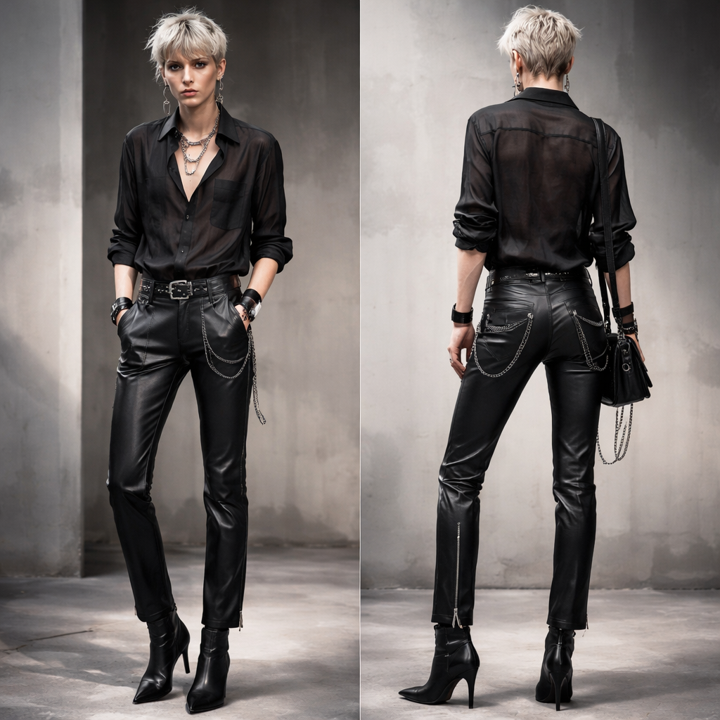 Cigarette pants Androgynous Edgy, artsy style, show front and back