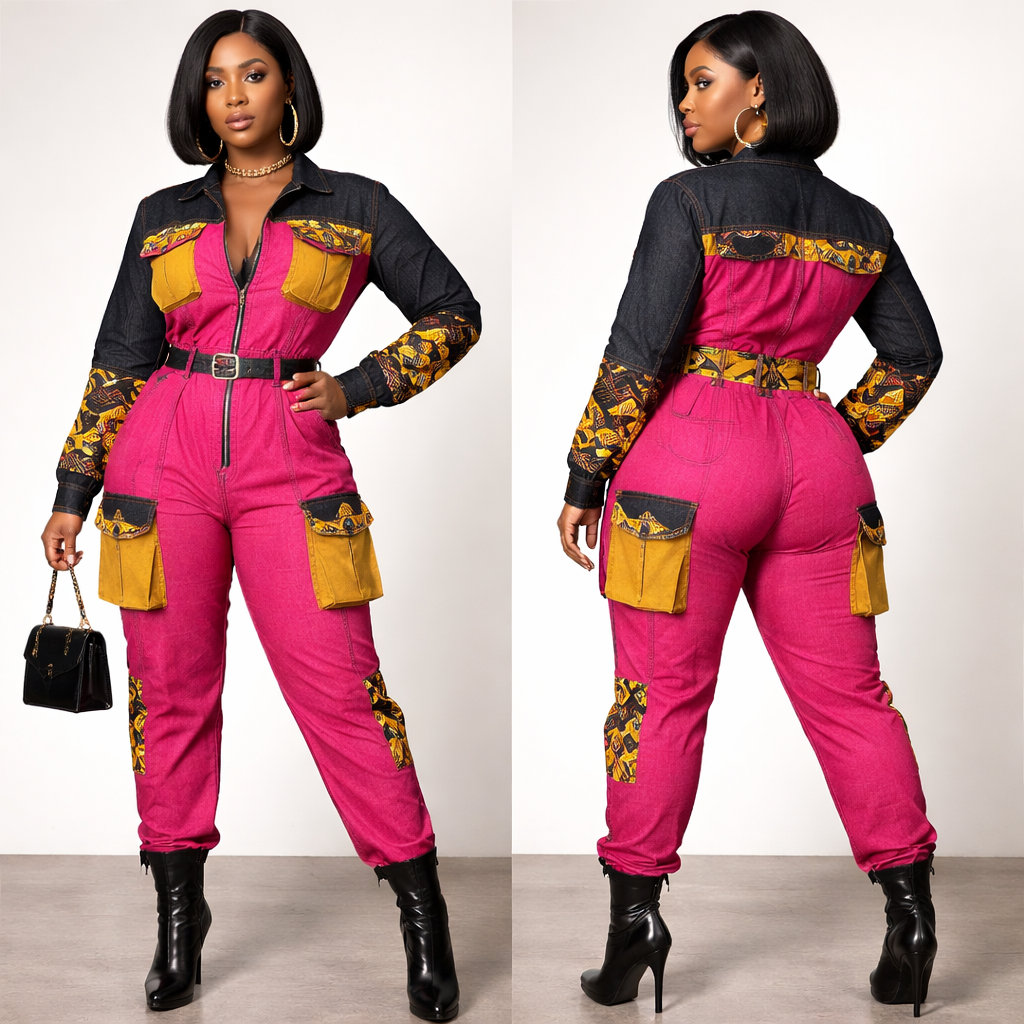 Cinched waist fuschia, mustard, and black african detail denim utility jumpsuit size xl on 5’10” dark brown skin curvy ...