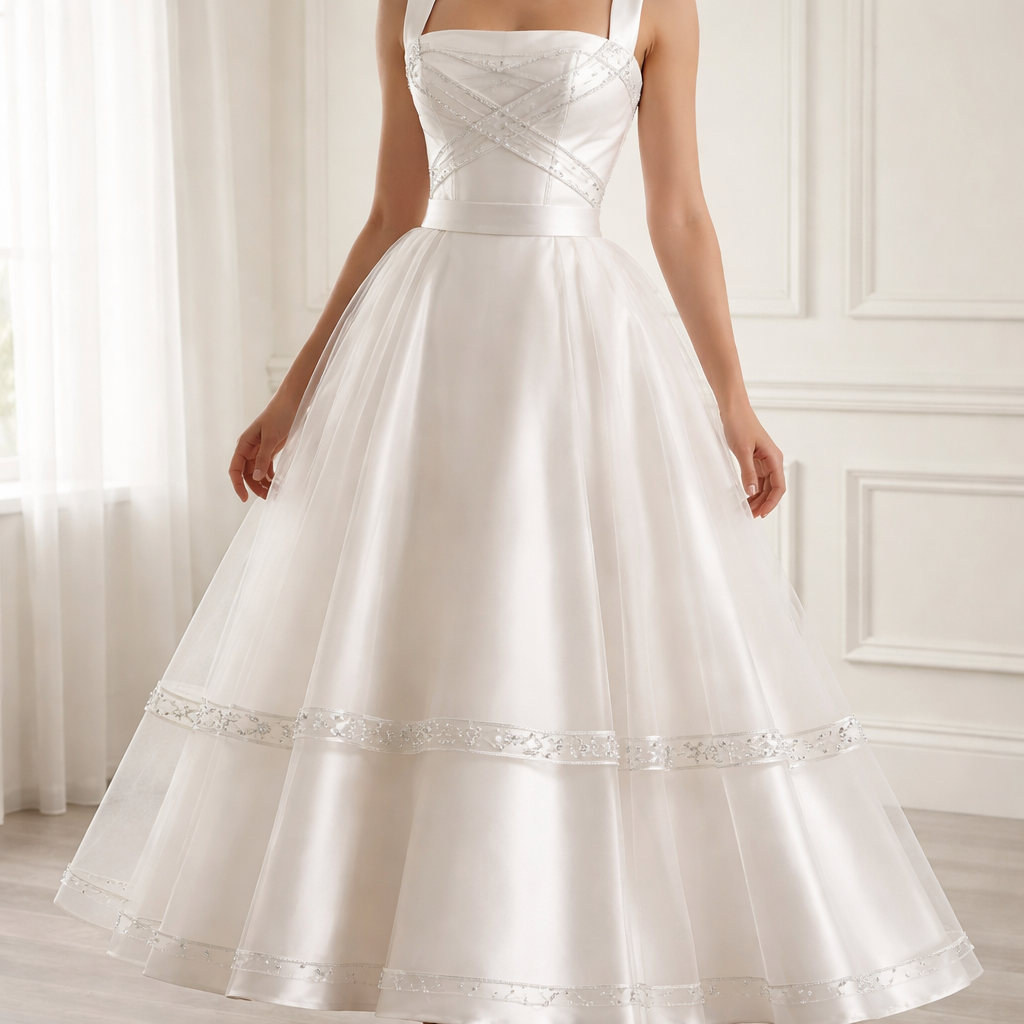 Wedding style dress. White. Silk. Size 14 UK. Corset bodice with several thin diagonally criss crossing ribbons across the whole chest area in a lattice pattern, a diamond studded where the ribbons overlap. Thick wide sleeveless straps. Box shaped neck line, flat across the top. A-line ankle length skirt, silk. Thick ribbon around the waist, no bows. Thick ribbon around the hem of the skirt studded with a line of diamonds. A second gauze skirt over the silk one, from waist stopping above the knee, also with a thick ribbon around it, studded with a line of diamonds.