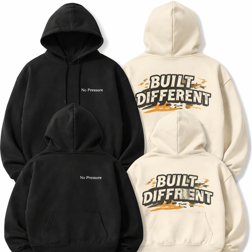 Plain hoodie (black/grey/cream) • Small chest logo (left side) • Clean font like: “No Pressure” or “Stay Solid Front...