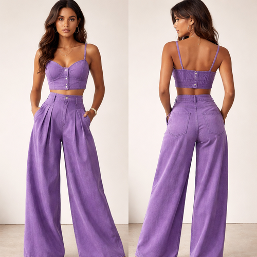 Hogh waist Palazzzo Pleated pants Purple color Pockets Denim Matching top