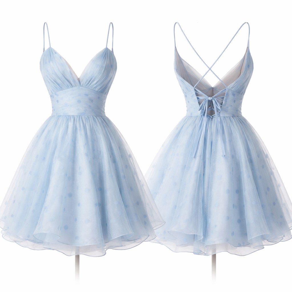 Short feminine soft luxury dress in baby blue fabric with subtle darker blue polka dots. The dress features thin delicate spaghetti straps and a deep V neckline with soft gathered detailing at the bust. The waist is slightly defined to enhance the silhouette, flowing into a voluminous, airy skirt made from lightweight layered organza. The hemline is structured with a soft rounded finish to add movement and elegance. The back is open with thin criss-cross straps and a tie detail, creating a delicate and feminine look. The overall design is minimal, elegant, and summery with a soft luxury aesthetic, summer style, show front and back