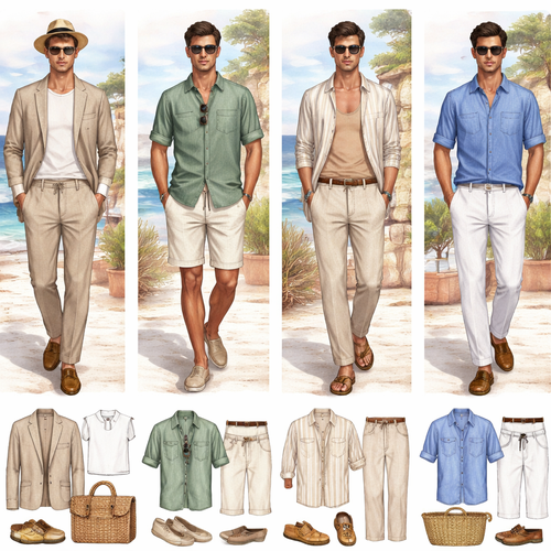 A Female Dress design, suitable for Spring. Realizzami 4 outfit per uomo estivi tutti i vestiti devono essere realizzati...