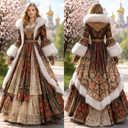 A Female Dress design, suitable for Spring. Consider Russian fashion — fur and layering traditions, bold patterns, mix o...