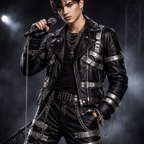 I want to create a unique set for a singer he loves black colors but accessorize it to be very cool add silver straps to...