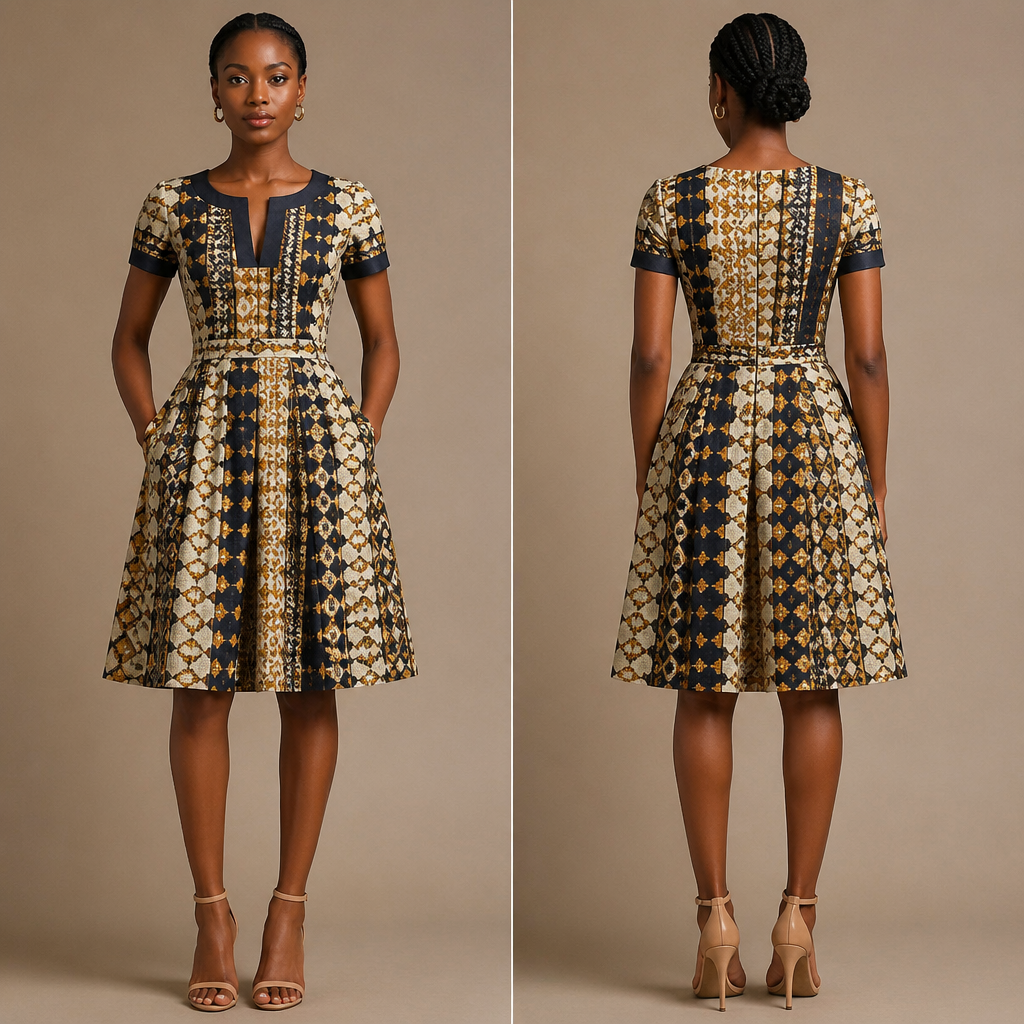 A Female Dress design, in Classic + Casual style. Ghana fashion aesthetics.