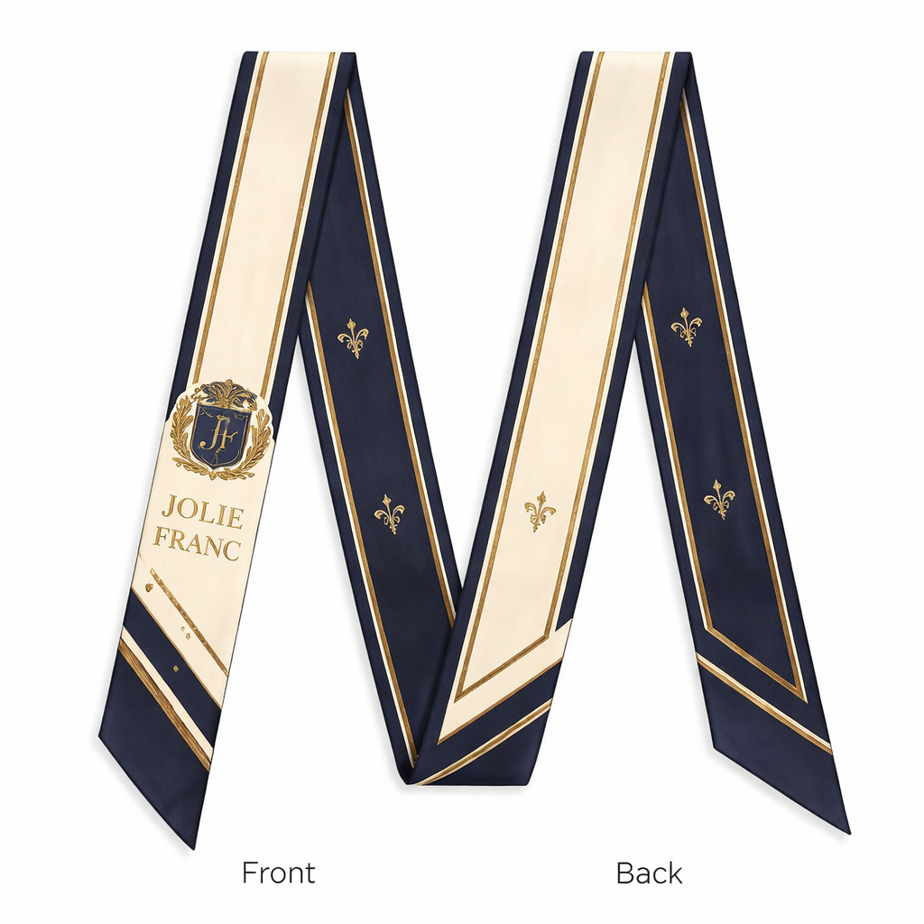 Design a silk scarf that is 5 x 86cm to be wrapped around a top handle of a handbag. It going to be the signature scarf for my brand Jolie Franc. The style is classic timeless, tailored. With a touch of heritage. Keep it simple and no chains. Think like it’s for a sorority and exclusive club. Now make it iconic, classic style, show front and back