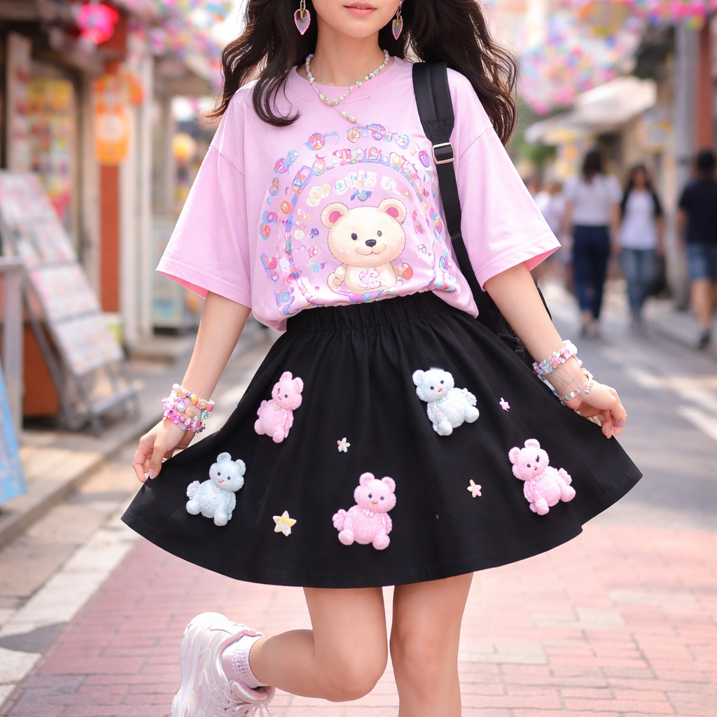 Japanese Street fashion design: **Japanese Street Style Prompt:** Above-the-knee black cotton skirt, A-line fit, with scattered 3D pastel alpaca motifs. Pair with an oversized graphic tee and platform sneakers for a playful, Harajuku-inspired look.