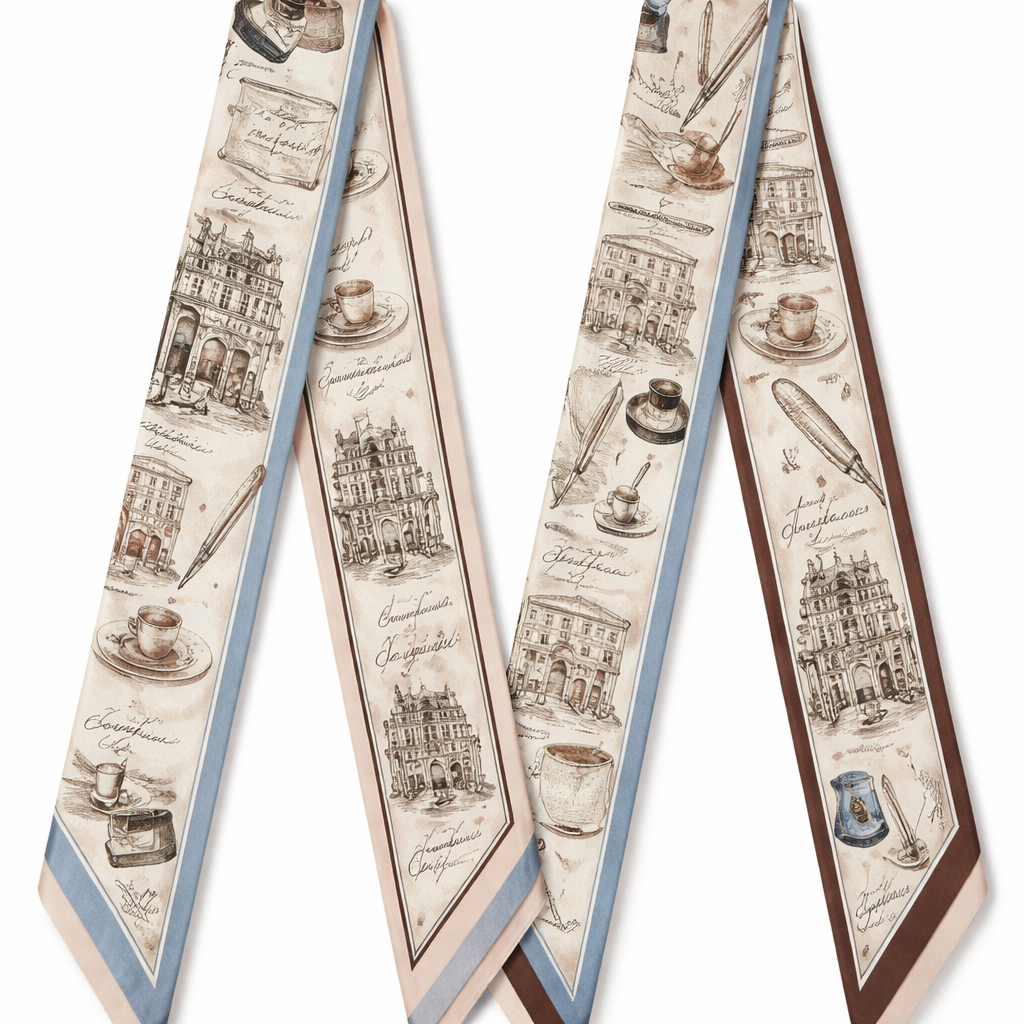 Design a silk scarf thanks 5x 86cm to be wrapped on the handle of a purse. Lean into French intellectual heritage—not universities. Inspiration • Left Bank cafés • Vintage Paris library card graphics (reimagined) • Hand-drawn quill lines • Architectural line art (generic, not Notre Dame, Sorbonne, etc.) Color ideas • Soft black + parchment • Dusty blue + ivory • Blush + espresso brown