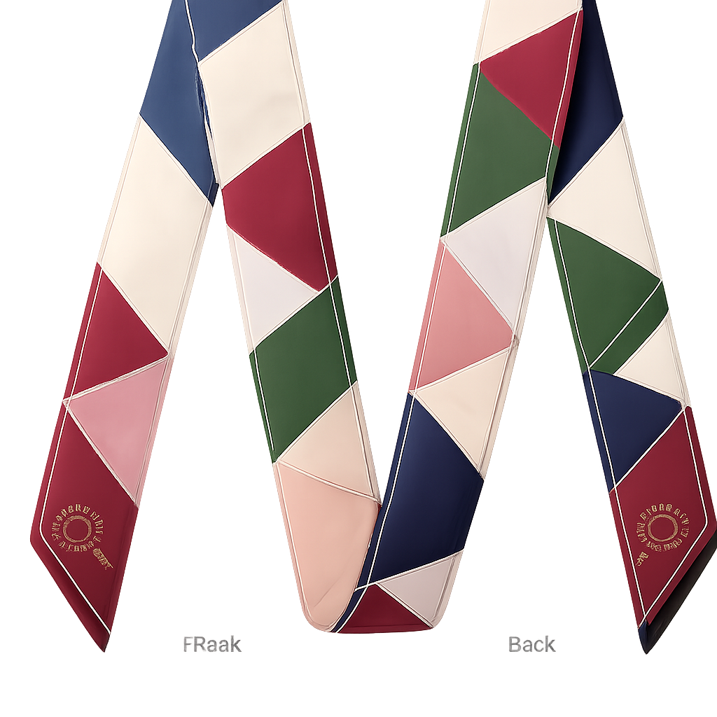 Design a silk twilly that is 5x 86 cm to be wrapped around the handle of a purse Make it iconic patchwork that is simple and tailored like the one from J.Press that chuck bass wore in Gossip girl. A feminine version. Way more simple. Add my Jolie Franc logo at oblique edges. Needs to be sophisticated , classic style, show front and back