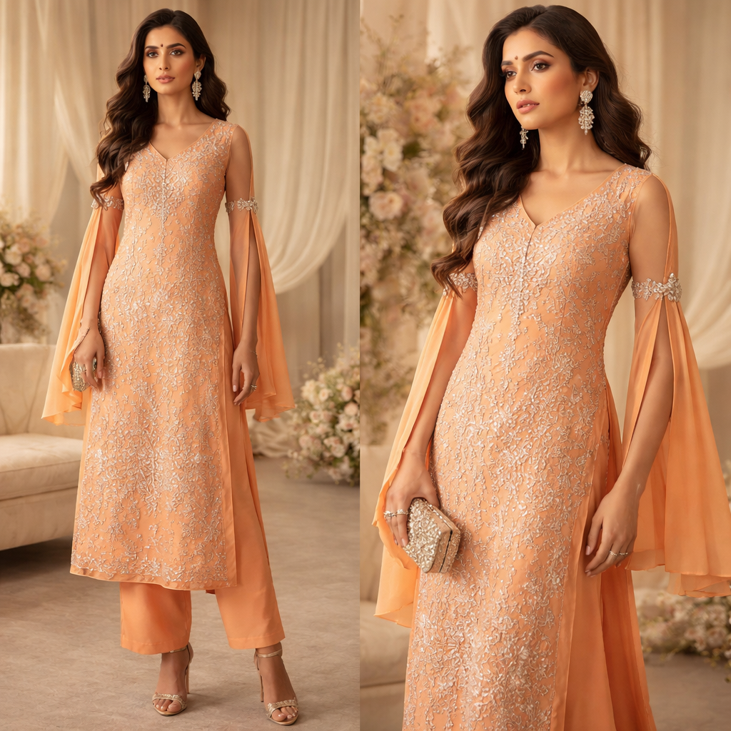 Pastel orange color tissue silk suit with Dana cut embroidery on shirt, silk lining under shirt and silk pants. The shirt should be long until calves. Make the slit sleeves from the elbow area. Above elbow area tie fancy gems buttons to close the slit.