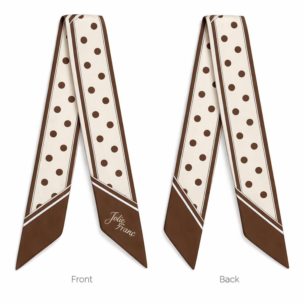 Design a silk scarf thanks 5x 86cm to be wrapped on the handle of a purse. No logos or any school relation but a collegiate feel. Create a signature look for my brand Jolie Franc. Keep it simple and tailored do polka dots Ivory combination with brown, classic style, show front and back