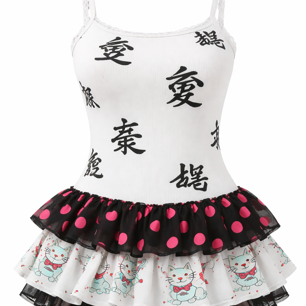 Romantic fashion design: Feminine white cotton tank top, fitted silhouette. Black Asian lettering randomly placed. Two ruffled layers at the bottom: one black with large hot pink polka dots, the other featuring line drawings of cute aqua cats with red stripes.