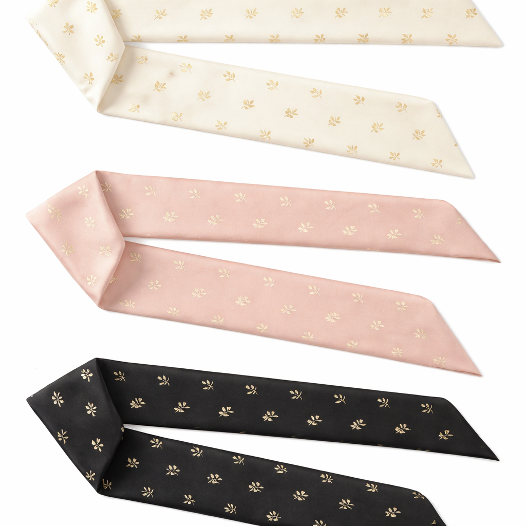 Design a silk scarf that is 5 x 86 cm with oblique edges. Design: Tiny laurel leaves spaced evenly (not dense) • Scale: Each motif no larger than 6–8 mm • Symbolism: Achievement, success, honor Works especially well in: • Gold on ivory • Pearl on blush • White on black